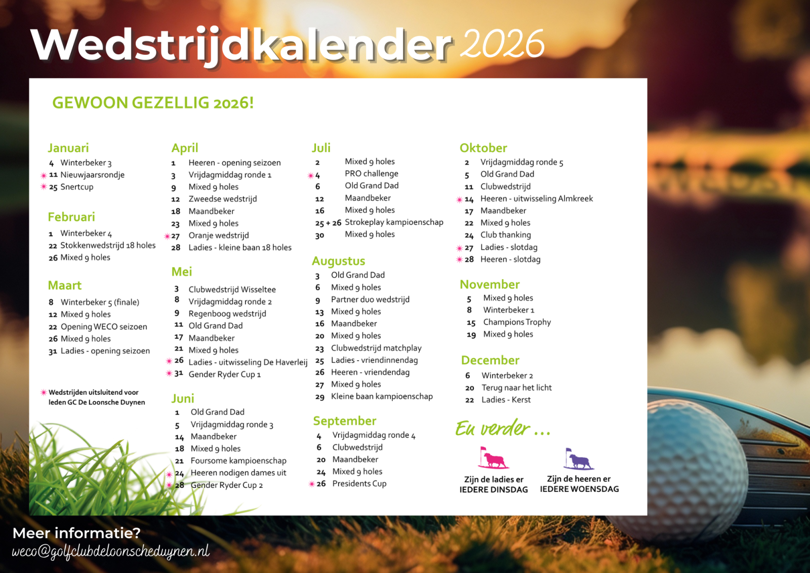 Zie hieronder de agenda voor 2026. Meer informatie over bijv. de Damesdagen vind je links in het menu.