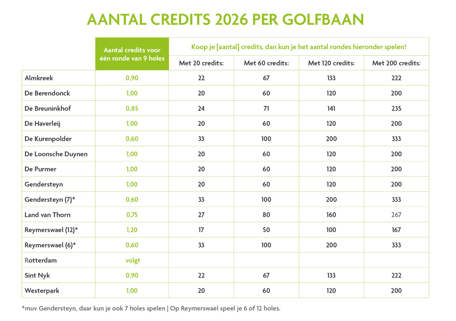 Hieronder een overzicht hoeveel rondes je op een specifieke shortgolfbaan kunt spelen met een speelrecht HGC Shortgolf. Als je dus al je rondes maar op één specifieke shortgolfbaan zou spelen. Maar het leuke van credits is natuurlijk dat je én overal kunt golfen én altijd tegen een